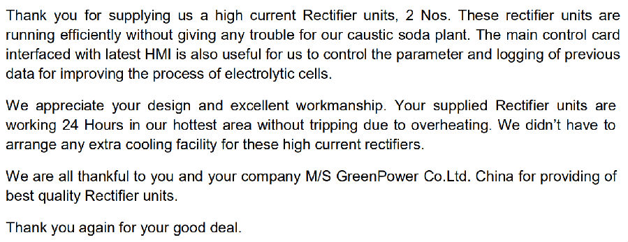此巴基斯坦公司曾订购电竞牛的氯碱电解整流器,用于生产烧碱(氢氧化钠NaOH),经过多年的运行,目前仍无故障可靠运行,受到客户的高度称赞,以下为该公司的感谢信。